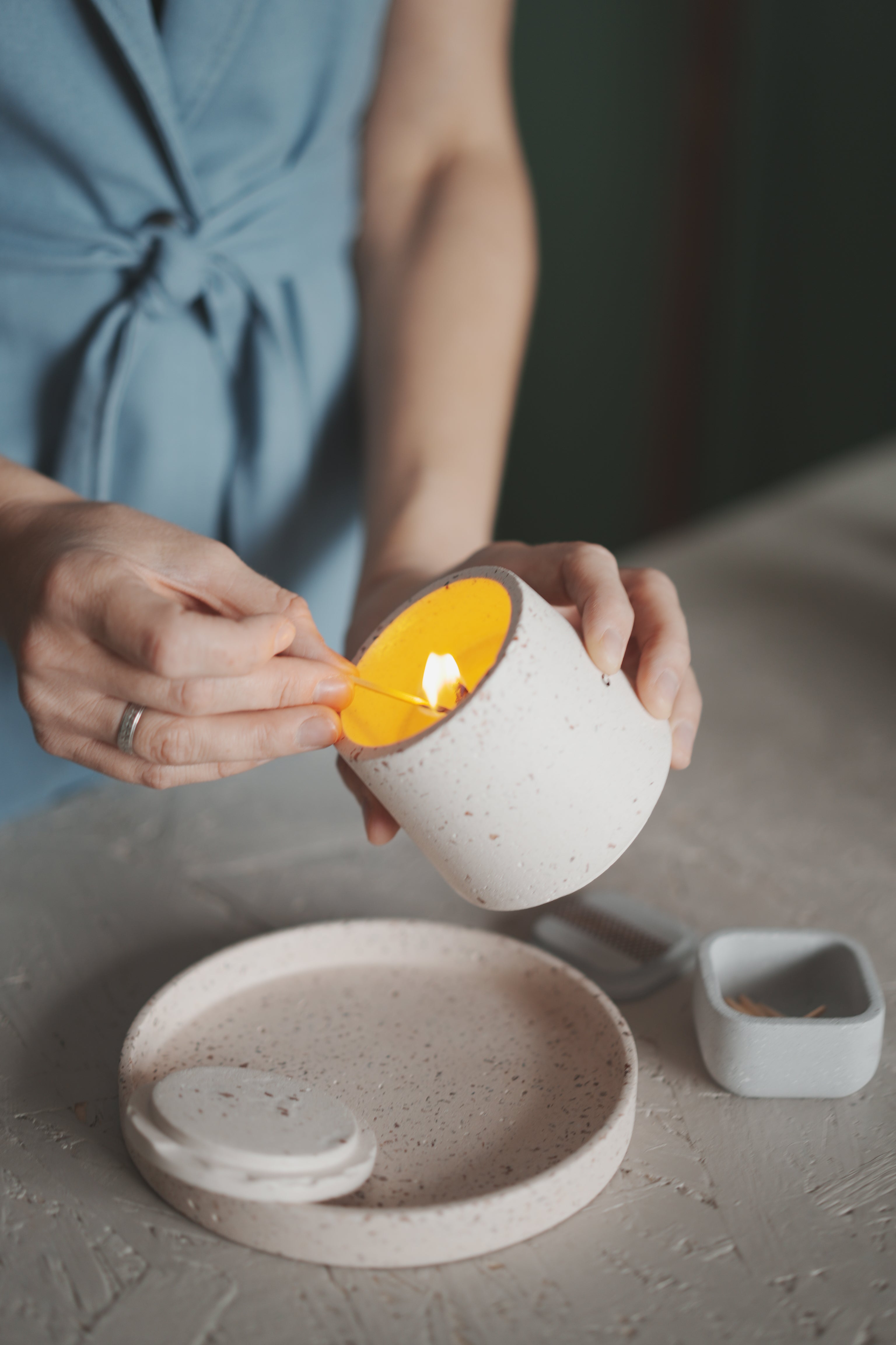 Soy scented candles in a concrete cachepot. Fills the space with a...